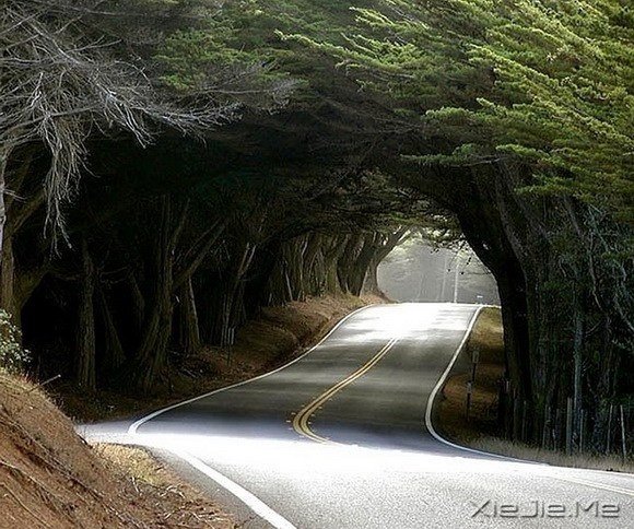 美国加利福尼亚州门多西诺郡的天然树隧道,座落于海滨沙滩北部的1号高速路。这条树隧道是1号高速路的标志性地点,同时也是当地驾驶者的最爱。